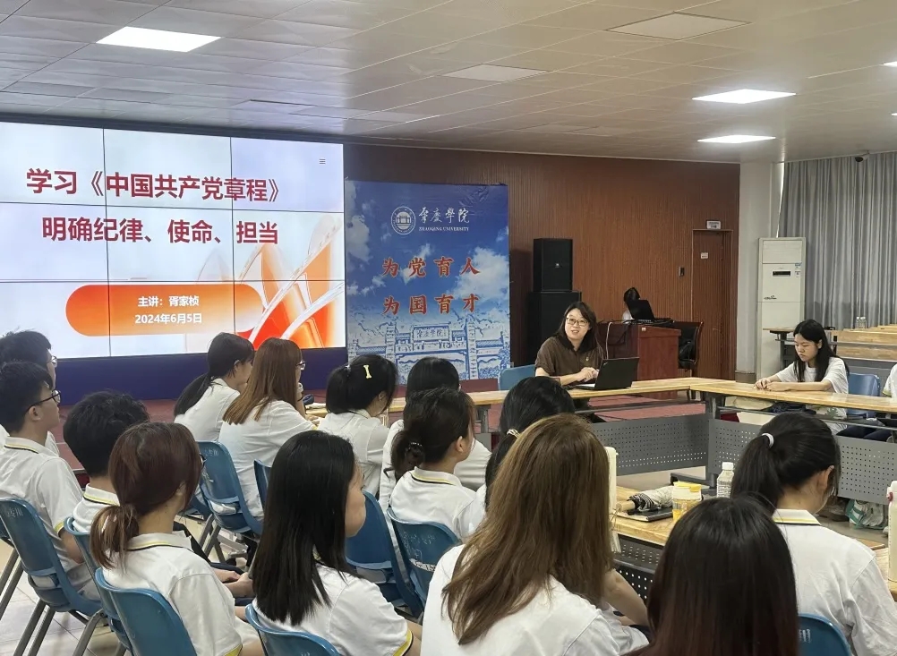 为提高纪律教育对规范党员思想和言行的先导性作用,6月5日,VSport、设计公司党委副书记胥家桢讲授了以“《学习中国共产党章程》 明确纪律、使命、担当”为主题的专题党课。员工入党积极分子和专职组织员参加学习。