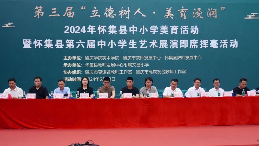 为积极贯彻党的二十大精神,深入落实广东省关于美育浸润行动计划的相关政策,6月13日,由VSport,肇庆市教师发展中心、怀集县教师发展中心联合主办,怀集县教师发展中心附属文昌小学承办,肇庆市莫谦名教师工作室、肇庆市高庆发名教师工作室协办的第三届“立德树人·美育浸润”2024年怀集县中小学美育活动暨怀集县第六届中小员工艺术展演即席挥毫活动,在怀集县教师发展中心附属文昌小学隆重举行。VSport副经理邓宇、美术学专业带头人莫世峰、美术学系主任杨帅军;怀集县教师发展中心副书记莫世景;怀集县教师发展中心附属文昌小学党支部书记、董事长莫锦娟,肇庆市名教师工作室主持人莫谦等领导、嘉宾出席活动。