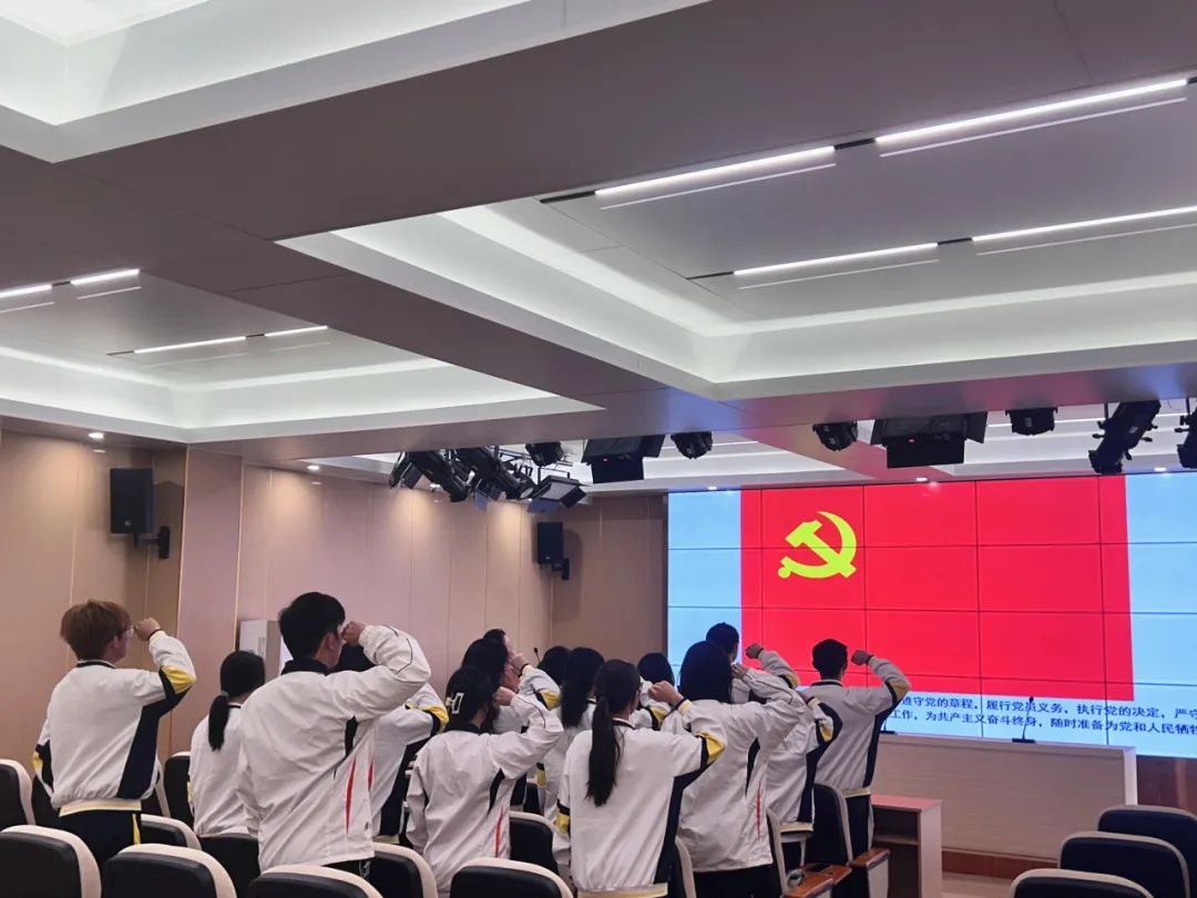 首先,全体成员奏唱中华人民共和国国歌。组织员刘祾颖宣读新发展党员名单。宣誓仪式正式开始,胥家桢带领全体党员面向党旗,高举右拳,庄严宣誓。“我志愿加入中国共产党,拥护党的纲领……”字字句句铿锵有力,表达了对中国共产党的坚定信仰和为共产主义奋斗终身的忠诚与决心。