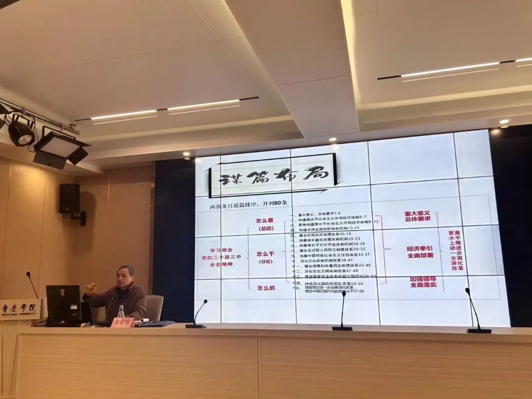会上,秦祖明深刻剖析了党的二十届三中全会审议通过的《中共中央关于进一步全面深化改革、推进中国式现代化的决定》的重大政治意义和历史使命,指出贯彻落实党的二十届三中全会精神,要在“怎么看”上统一思想,在“怎么干”上凝聚共识,在“怎么抓”上精准发力。他紧密围绕党的二十届三中全会的主题和意义,进一步全面深化改革的指导思想、总体要求和基本原则,聚焦重点在更高水平上进一步全面深化改革,加强党对改革的领导等四个方面对党的二十届三中全会精神进行了系统阐释,让参会师生深刻理解到进一步全面深化改革、推进中国式现代化的重大意义。