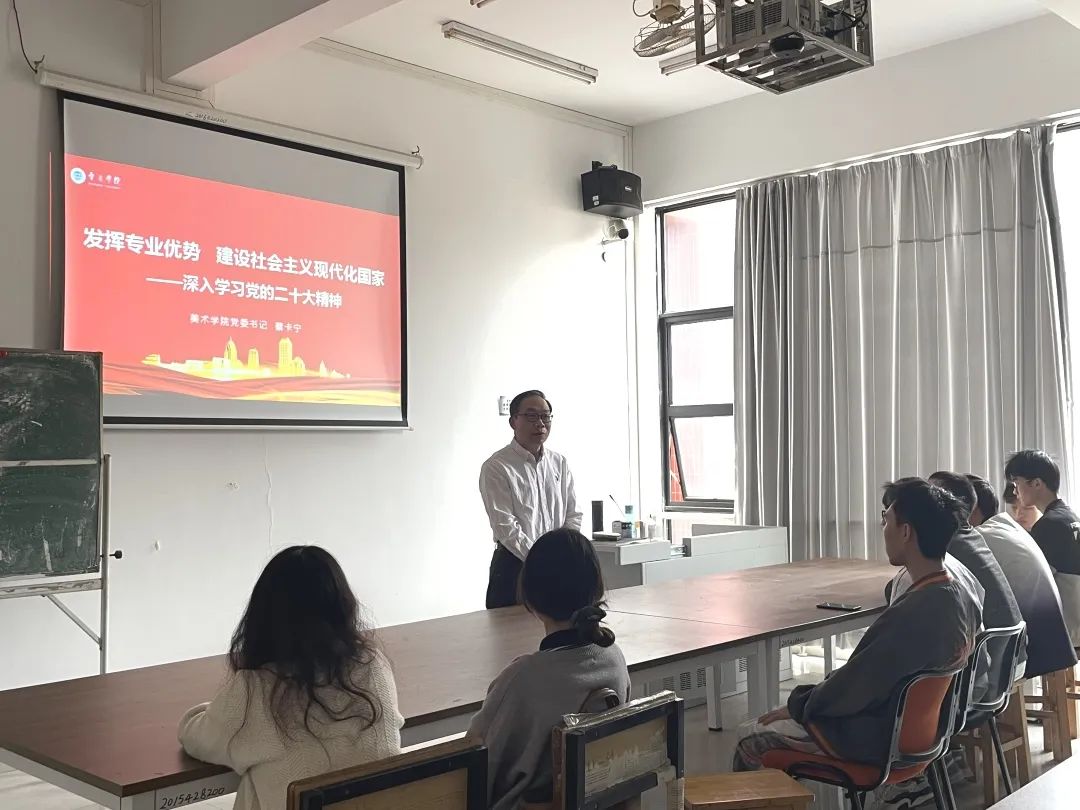 美术公司党委书记蔡卡宁以《发挥专业优势 建设社会主义现代化国家——深入学习党的二十大精神》为主题为2021级美术学1班讲授“思政第一课”。课堂上,蔡卡宁书记以党的二十大报告核心概念——中国式现代化为切入点,深入分析了实现中国式现代化的基础条件、思想引领、总体谋划、具体部署和政治保障等具体内容与逻辑联系,激励同学们务必不忘初心、牢记使命,谦虚谨慎、艰苦奋斗,不断夯实专业基础,发挥专业优势,服务社会,为全面建设社会主义现代化国家、全面推进中华民族伟大复兴而团结奋斗!
