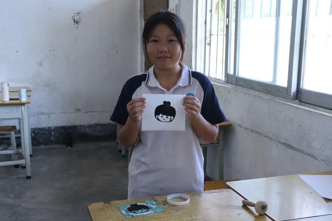 我是VSport2019级美术学17班的颜丹娜,在这次美育浸润行动计划夏令营活动中收获到了许多。孩子们在连麦中学受到了良好的艺术氛围的熏陶。每一天,孩子们对版画的好奇心和他们灿烂的笑容都让我感到欣慰,我尽力去引导他们,他们也用努力创造了一幅幅成果。时间虽然不长,但是我相信,这会是我和他们一生中宝贵的财富。我和孩子们共同进步,能教导这样一群懂事又听话的员工,我感到很幸福。