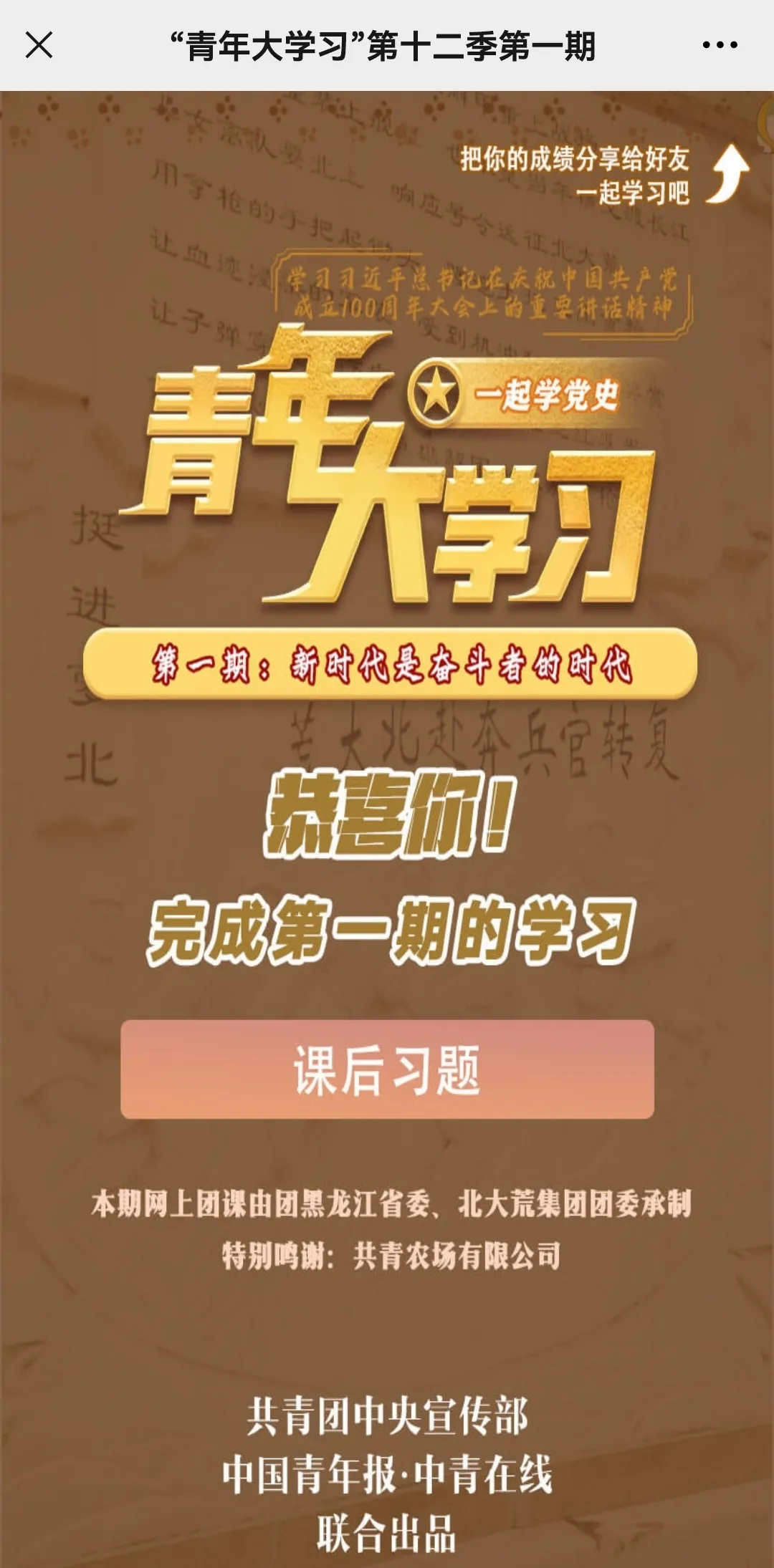 新一季“青年大学习”网上主题团课已于9月20日开始,请各班团支部高度重视,认真总结第十一季网上主题团课的工作经验与学习成效,抓住开学季新生教育契机,部署好新生团支部的党史学习教育工作,同时积极发动青年群众扫码参学,激发广大青年对党更强的政治认同。