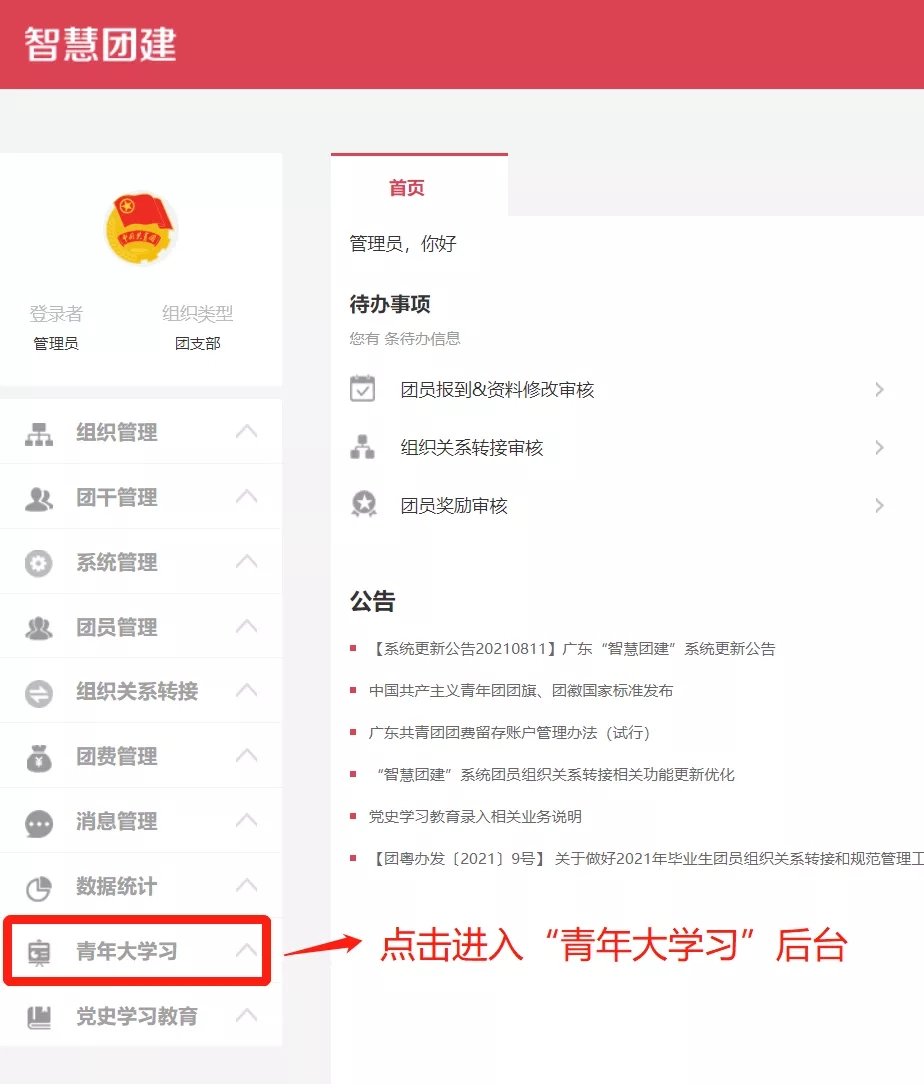 1.先由团支书登录“智慧团建”(https://tuan.12355.net/),点击左侧菜单栏处“青年大学习”进入管理后台,生成邀请参学海报(每一个团组织生成的二维码均不同)。