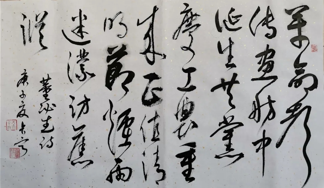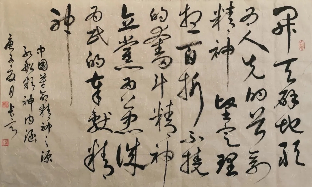 为此,我的心情格外激动,格外兴奋。一口气以草书的方式创作了两幅作品,一幅是董必武的诗,另一幅是红船精神内涵。字写得不怎么样,但字的结构、表达的形式以及方式是值得肯定的。字里行间透露出我作为一名32年党龄的党员对党的忠诚。心里想起了那些为祖国鞠躬尽瘁的伟人,他们是人民公仆,他们像蜡烛点燃自己照亮别人,为党和人民奉献自己的光和热。我的作品是以自己的实际行动,阐述了党的光辉,感动着我的心,点燃了我心中对党和祖国的无限热爱!