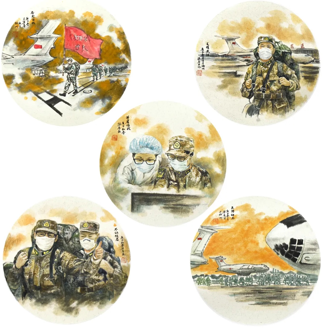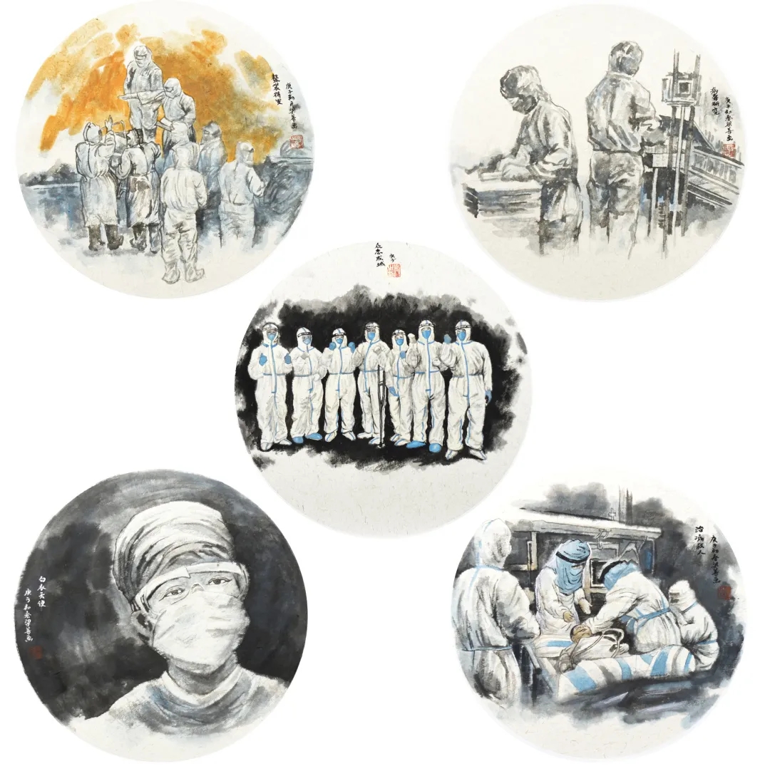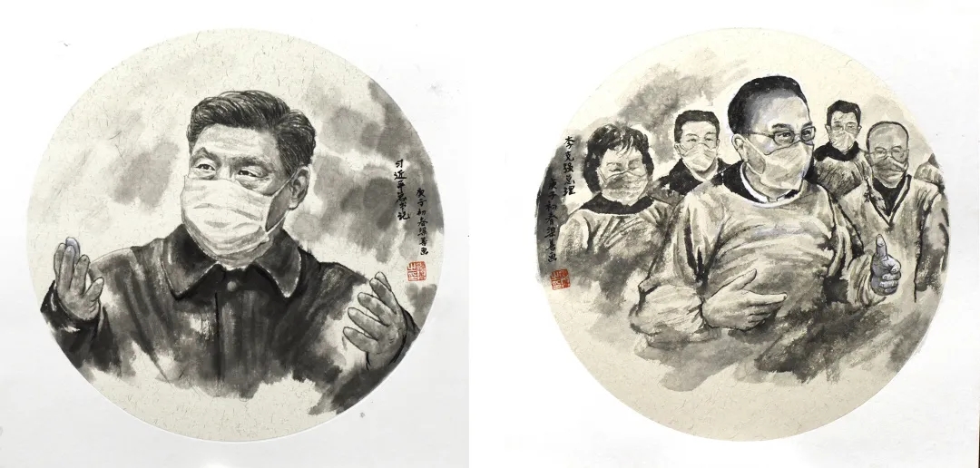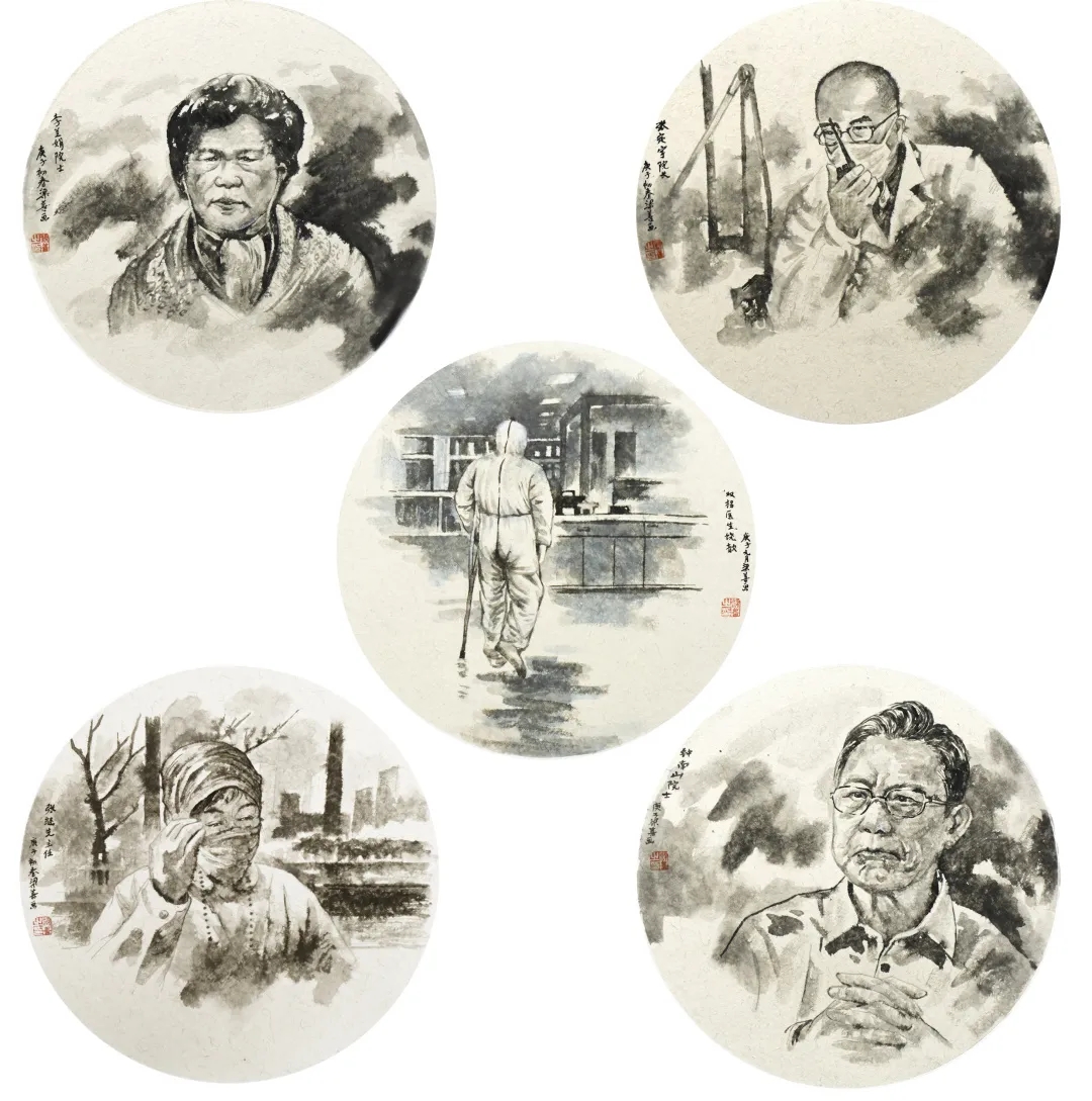 率先垂范:《李克强总理》、《钟南山院士》、《李兰娟院士》、《张定宇经理》、《双拐医生铙歆》、《张继先主任》(国画,33x33cm)。