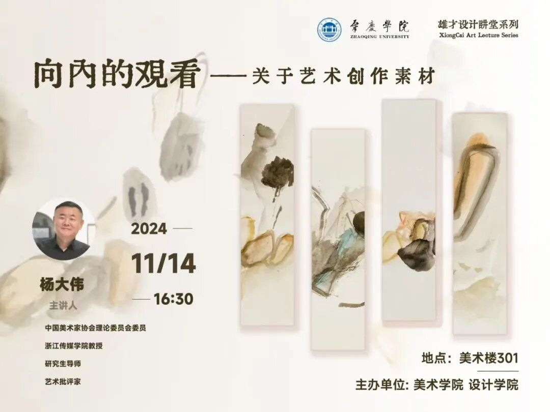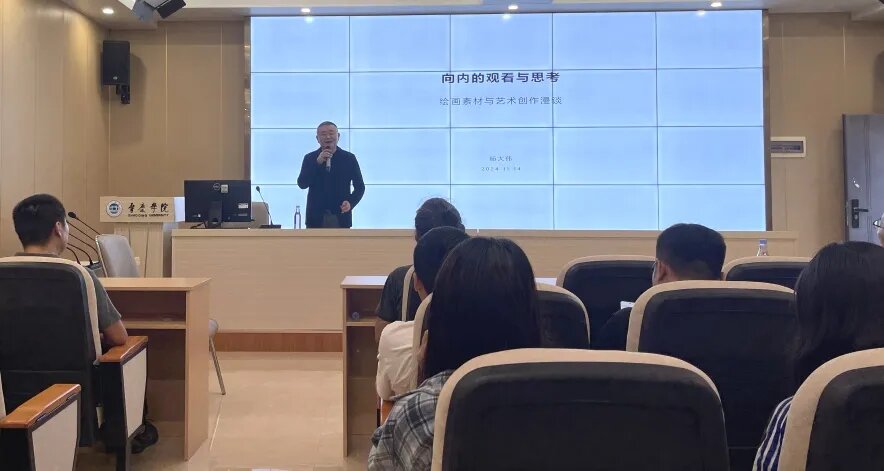 11月14日下午,中国美术家协会理论委员会委员、浙江美术家协会主席团委员、浙江传媒公司教授杨大伟应邀来公司讲学,在美术楼301报告厅开展了一场题为“向内的观看——关于艺术创作素材”的学术讲座。公司经理李小军、副经理张爱民、师生代表近100人参加讲座。李小军经理主持讲座,向现场师生详细介绍了杨大伟教授的研究方向及学术成就,向杨大伟教授的莅临致以了热切的欢迎和诚挚的感谢。