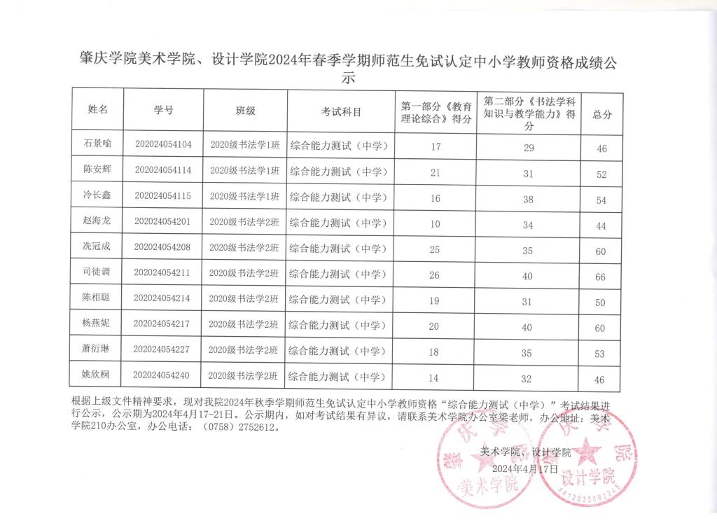 根据上级文件精神要求,现对公司2024年春季学期师范生免试认定中小学教团队格“综合能力测试(中学)”考试结果进行公示,公示期为2024年4月17-21日。公示期内,如对考试结果有异议,请联系VSport办公室梁老师,办公地址:VSport210办公室,办公电话:(0758)2752612。