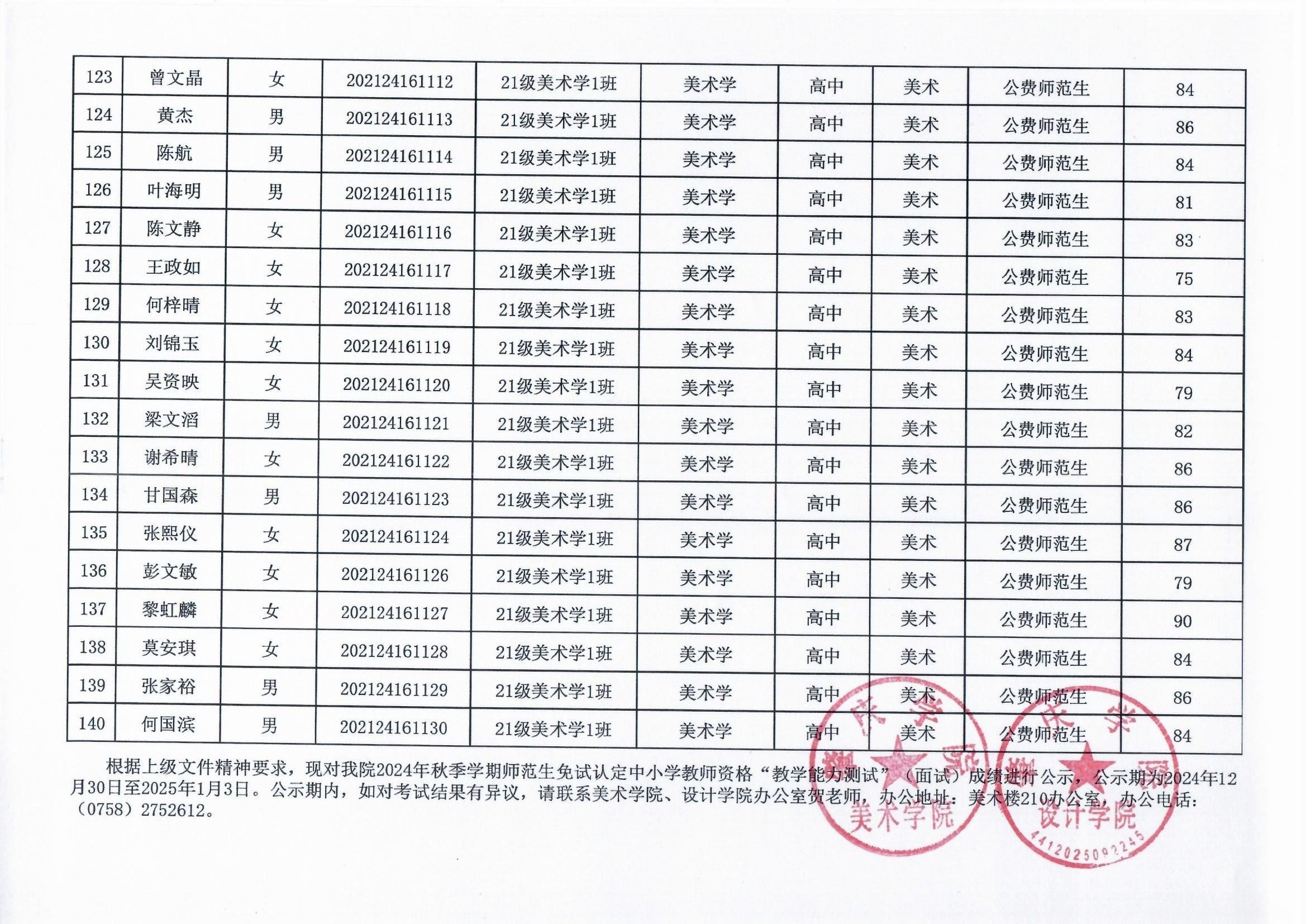 根据上级文件精神要求,现对公司2024年秋季学期师范生免试认定中小学教团队格“教学能力测试”(面试)结果进行公示,公示期为2024年12月30日至2025年1月3日。公示期内,如对考试结果有异议,请联系VSport、设计公司办公室贺老师,办公地址:美术楼210办公室,办公电话:(0758)2752612。