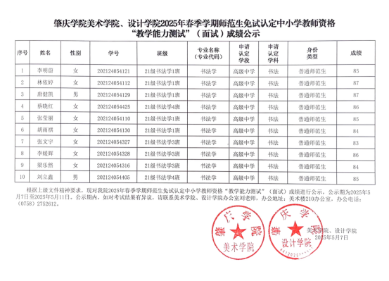 根据上级文件精神要求,现对公司2025年春季学期师范生免试认定中小学教团队格 “教学能力测试”(面试)成绩进行公示,公示期为2025年5月7日-5月11日。公示期内,如对考试结果有异议,请联系VSport办公室刘老师,办公地址:VSport210办公室,办公电话:(0758)2752612。